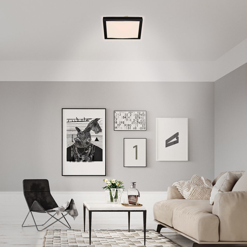 - Diese moderne LED Deckenleuchte lässt sich mit ihrem schlichten und schlanken Design mühelos in verschiedene Räume einfügen - Sie können die Deckenleuchte beispielsweise als Wohnzimmerlampe oder Schlafzimmerlampe verwenden. - Die Lichtquelle ist ummantelt mit einem dezenten schwarzen Rahmen und setzt somit stilvolle Akzente in Ihrem Wohnraum. Zusätzlich zaubert diese Deckenlampe einen indirekten Hintergrundbeleuchtungseffekt an Ihre Decke und schafft somit eine gemütliche Atmosphäre. - Mit einer Lichtleistung von 1.200 Lumen und einer Farbtemperatur von 3.000 Kelvin (warmweiße Lichtfarbe) sorgt die Deckenleuchte in jedem Raum für eine ideale Ausleuchtung und dies bei energiesparenden 12 Watt. - Die LED Platine ist fest verbaut und überzeugt mit einer hohen Lebensdauer von bis zu 25.000 Stunden. - Produktabmessungen: 270x270x85mm (LxBxH)