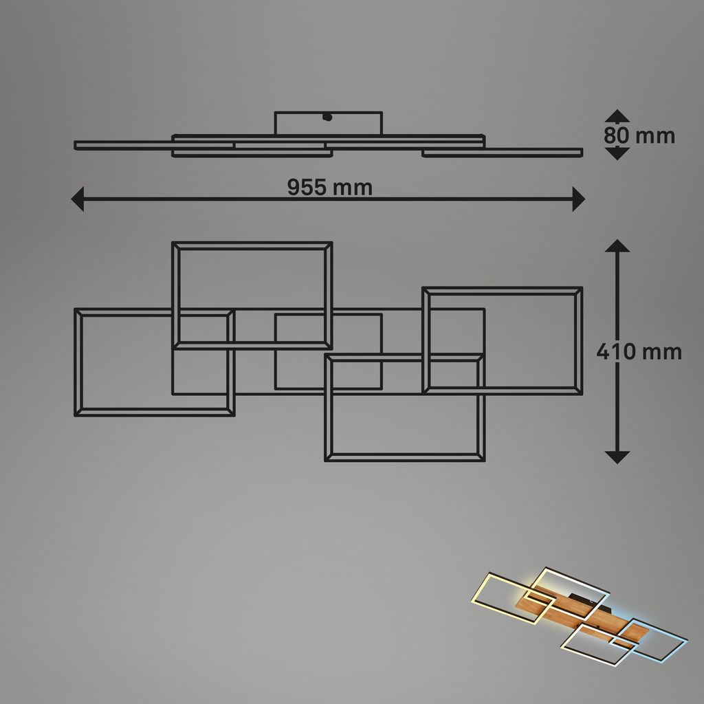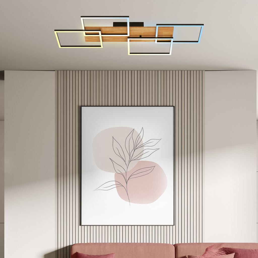 Anpassungsfähige Lichtoptionen Diese Wohnzimmerleuchte ist mit einer 44W LED-Platine ausgestattet, die 4400 Lumen liefert und eine Farbtemperatur von warmweiß (3000K) bis tageslichtweiß (6500K) anpasst, ideal für verschiedene Beleuchtungsanforderungen. Stilvolles Holzdesign Die Kombination aus schwarzem Metall und Holzelementen verleiht dieser Deckenbeleuchtung einen modernen, aber dennoch warmen Look, der zu unterschiedlichen Einrichtungsstilen passt. Stufenlose Dimmbarkeit und Backlight Diese Schlafzimmerleuchte bietet stufenlose Dimmbarkeit und verfügt zusätzlich über ein Backlight, das für eine atmosphärische Beleuchtung sorgt. Beide Funktionen sind bequem per Fernbedienung steuerbar.Benutzerfreundliche Speicherfunktion Dank der integrierten Memory-Funktion merkt sich die Küchenlampe die zuletzt gewählten Einstellungen, was die Bedienung im Alltag erleichtert. Großzügige Abmessungen Mit Maßen von 955x410x85mm eignet sich diese LED-Leuchte besonders gut für größere Räume und dient gleichzeitig als auffälliges Designelement.