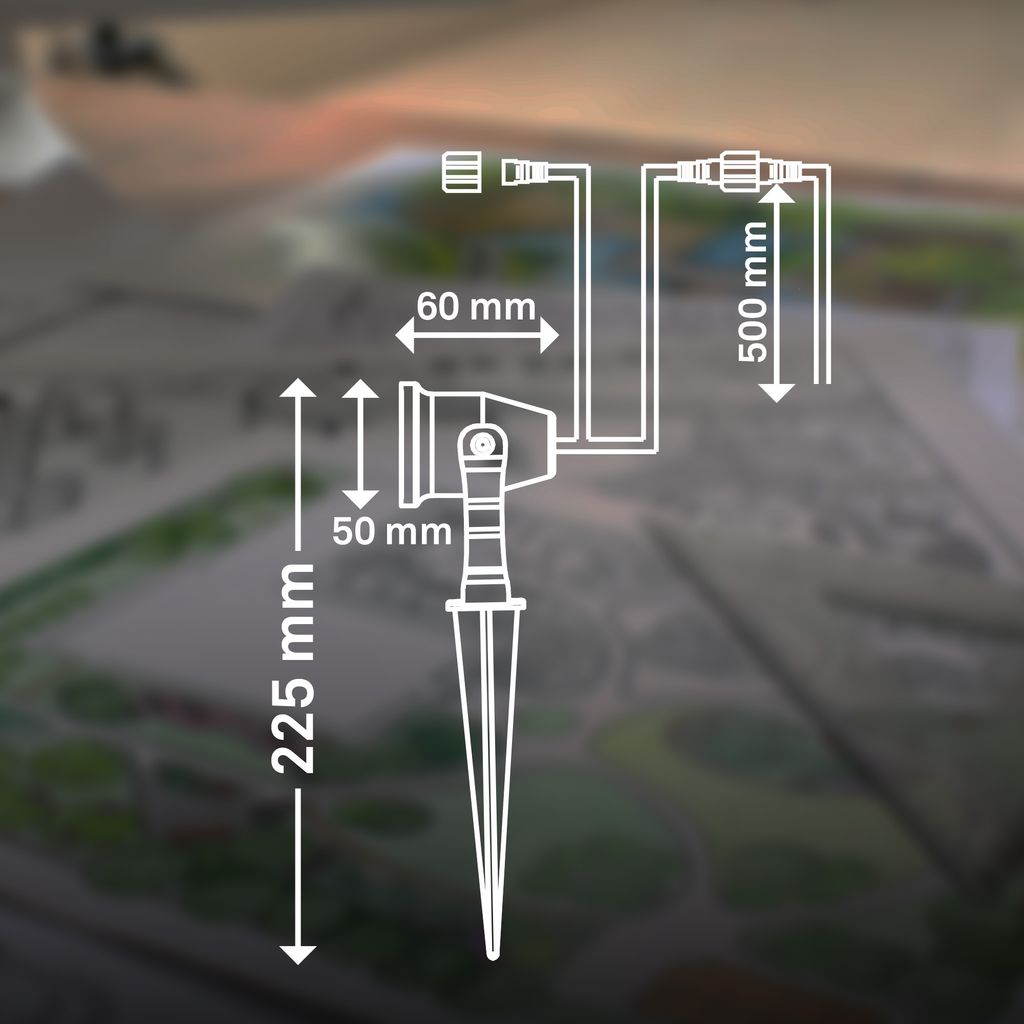 The garden lamp measures 55 x 60 x 225 mm and is equipped with 0.5 m input and output cables. This facilitates connection to an existing system and ensures flexible installation.